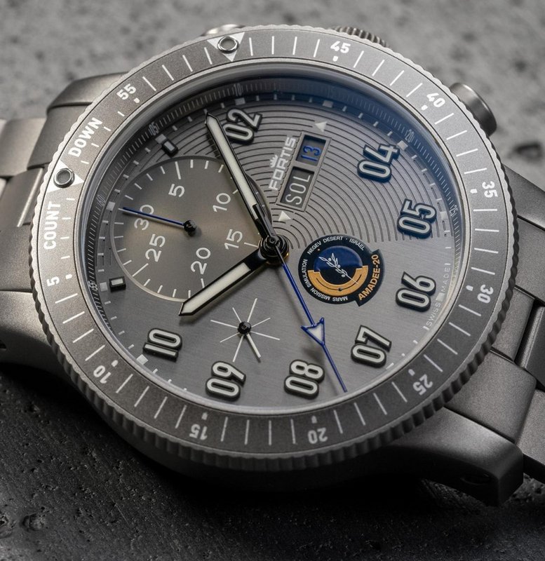 The case, in titanium, measures 44mm x 53mm x 15mm. It has an AR-coated sapphire crystal and it is water resistant to 200 meters. "Mission Control Bezel" with two lume indicators at the sixty and fifty mark. The average time lag between Mars and Earth is 10 minutes. A turn of the bezel lets the astronauts know exactly when further communication will be arriving from ground control.