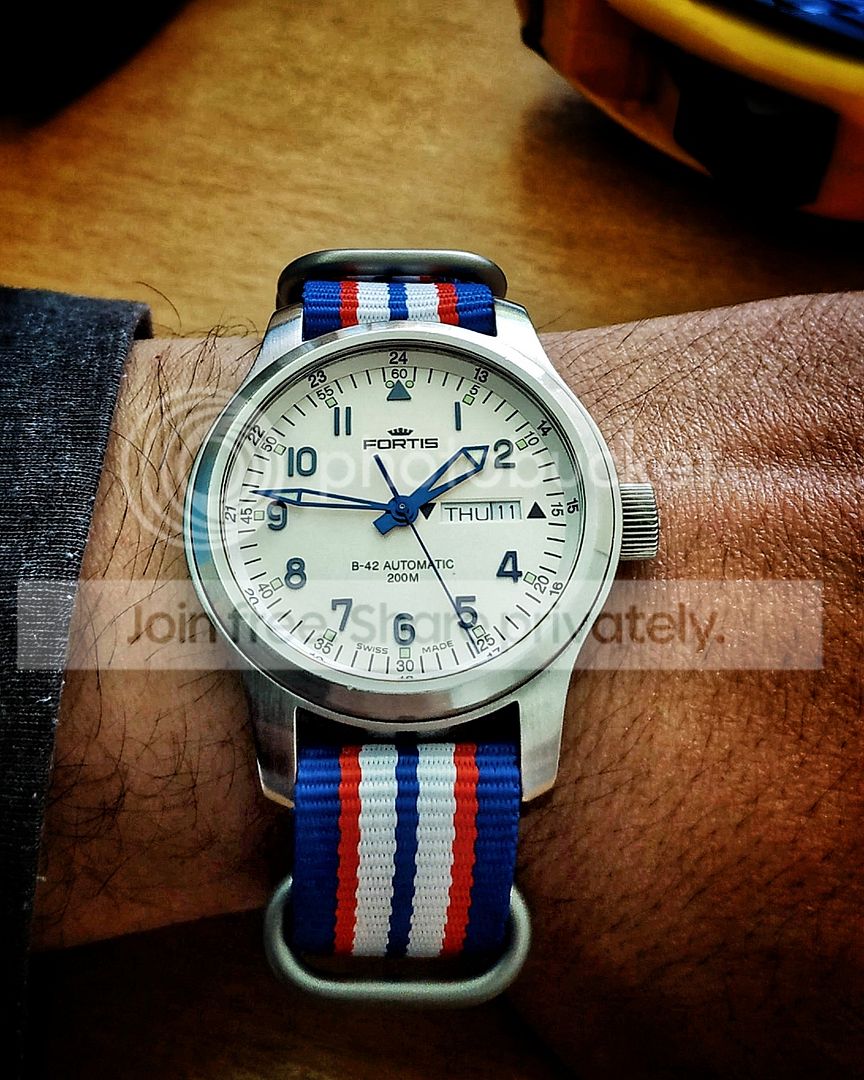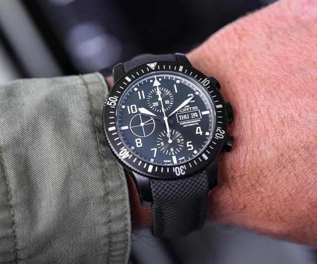 In addition to the tachymetre scale on the inner flange and the large luminescent Arabic numerals and hour markers, there is also a day/date window at 3 o’clock flanked by two arrows pointing in opposite directions. The arrows are to indicate in which direction to rotate the crown to adjust the date and day. The FORTIS brand name and logo are also positioned above the day/date window while the words Chronograph Automatic appear below it. Coupled with the neon berlac fluor orange chronograph hands and the colourful mission patch, the stylish dial is very legible in practically any light conditions thanks to the contrast of the white markings against the black background and the green Superluminova
