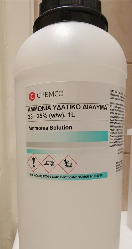 Είναι διάλυμα δηλαδή 23-25% w/w (κατά βάρος), για κάθε 100gr νερού βρίσκονται διαλυμένα 23-25gr αμμωνίας.