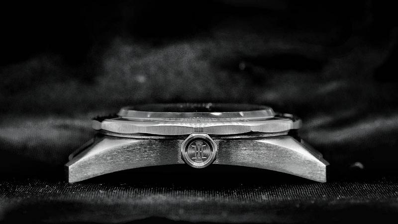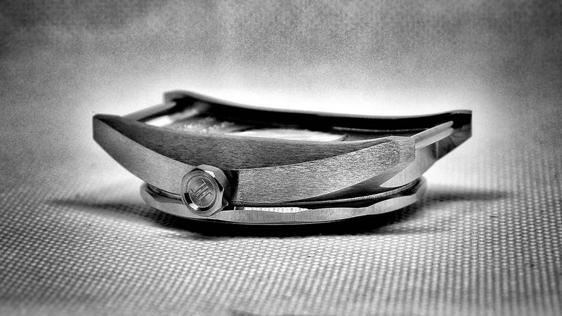 Πέρα τώρα από τις ελληνικές παραπομπές στον σχεδιασμό λίγα λόγια για τα υπόλοιπα στοιχεία του ρολογιού. Η κάσα είναι ατσάλινη, βουρτσισμένη μονομπλόκ πλάτους 44mm, lug to lug 54 mm (το νου σας είναι μεγάλο, τα ασθενικά χεράκια ίσως απογοητευτούν), στεφάνη και κορώνα (πιπίλα η κορώνα) κι αυτά 316L ατσάλι, το dial τύπου sandpaper (σμυριδόπανο) και επίσης sandwich με απίστευτο lum. Η κάσα έχει μία ελαφρά καμπυλότητα για να αγκαλιάζει τον καρπό. Κοιτώντας το πίσω μέρος της θα διαπιστώσεις ένα αυλάκι 20mm μέσα στο οποίο φωλιάζει το ποιοτικότατο rubber nato της bonetto cinturini ή το δερμάτινο αδιάβροχο nato με τα οποία έρχεται μαζί το ρολόι.