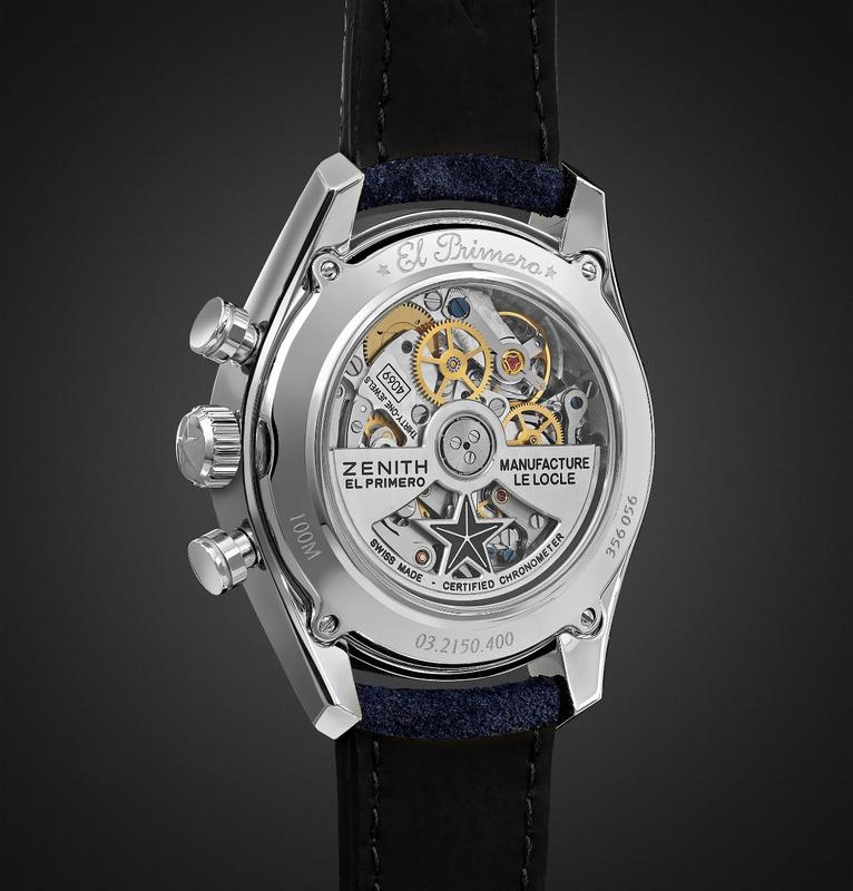 Movement is the Swiss automatic Zenith in-house caliber El Primero 4069 with 35 jewels, 36,000 vph and a power reserve of 50 hours. The rotor features Côtes de Genève decoration. Functions are: hours and minutes in the center, small seconds at 9 o'clock. Central chronograph hand and 30-minute counter at 3 o'clock.
