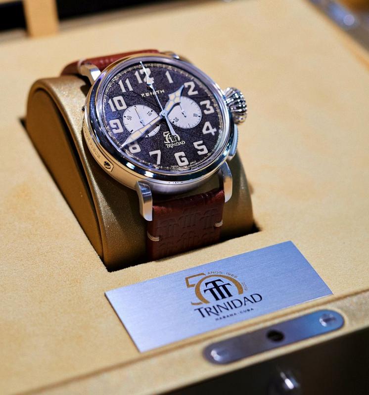 The case, in 18kt yellow, white or rose gold, measures 45mm x 14.2mm. It has a domed AR-coated sapphire crystal and it is water resistant to 100 meters. Engraved caseback with Trinidad 50th Anniversary logo.