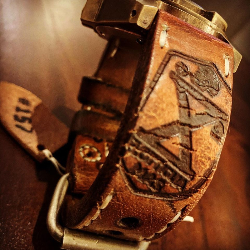 Έχουμε και λέμε λοιπόν. 7+ χιλιοστά πάχος ιταλικό μοσχαράκι επενδυμένο εξωτερικά με καραβόπανο προερχόμενο από αντίσκηνο του Γερμανικού Αφρικανικού Σώματος  ( Deutsches Afrikakorps) B’ Παγκοσμίου πολέμου, σταθερό keeper από φυσιγγιοθήκη Mauser, επίσης Β’ Παγκοσμίου και δεύτερο keeper από φυσιγγιοθήκη Mannlicher.  Το concept συμπληρώνει μια 4,5 χιλιοστών πάχους χειροποίητη, ορειχάλκινη (brass)  βιδωτή μπούκλα με γυαλιστερό τελείωμα ανάλογο της κάσας. Και κάποιες φωτογραφίες ….