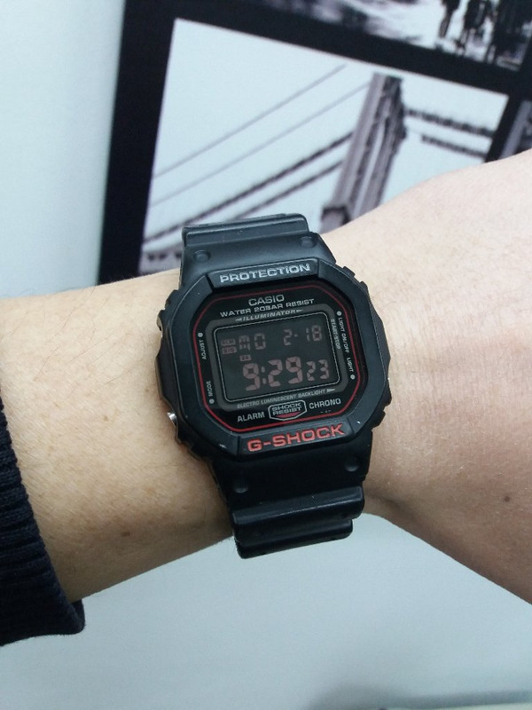 Ένα ιδιαίτερο κ σπάνιο 5600 το οποίο το πήρα για το negative display.Δεν έμεινα ευχαριστημένος γιατί το θεωρώ απο τα πιό δυσανάγνωστα lcd.Τα νούμερα έχουν ενα κοκκινωπό χρώμα το οποίο μόλις πέσει λίγο το φως της μέρας χάνεις την μπάλα.Το φως κάνει δουλειά αλλα δεν μπορείς καθε φορά να πατάς το κουμπί πόσο μάλλον που στην σειρά αυτή τα κουμπιά δεν πατιούνται κ τόσο εύκολα.Το έχω απο το 2008 κ μπαταρία άλλαξα περσι.Το έδωσα στην αδερφή μου γιατί της άρεσε κ το φοράει κάθε μέρα.Άλλωστε προτιμώ τα κανονικά display κ θεωρώ ότι τα negative μόνο εντύπωση κάνουν παρα λειτουργικά είναι.Στην συλλογή μου έχω κρατήσει ένα με negative display το οποίο θεωρείται κ το καλύτερο απο όλα τα Casio.Θα το ποσταρω κι αυτό κάποια στιγμη.Το 5600CL είναι ένα G-Shock square με τις βασικές λειτουργίες όπως το ξυπνητήρι,χρονόμετρο,αντίστροφη μέτρηση,αυτόματο φωτισμό(backlight),αντικρασδαμικό κ αδιάβροχο στα 200Μ.