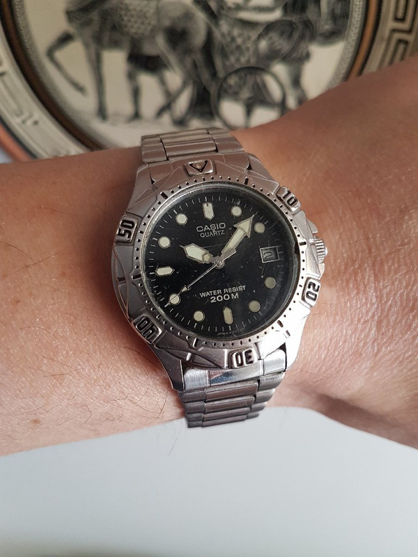 Ένα diver το οποίο το είχα κάνει δώρο στην αδερφή μου όταν έπιασα την πρώτη μου δουλειά.Μιλάμε τώρα πρίν 20 χρόνια.Ένα ωραίο καταδυτικό με βιδωτό καπάκι,βιδωτή κορώνα,περιστρεφόμενη στεφάνη κ αδιάβροχο στα 200Μ. Για χρόνια η αδερφή μου του ήπιε το αίμα στην σχολή της,στην δουλειά,καλοκαιρινά μπάνια κλπ. Μόλις ανακάλυψε τα τετράγωνα G το άφησε στην άκρη.Κάποια στιγμή όταν την ρώτησα γι'αυτό μου είπε ότι το έχει αλλα δεν δούλευε για κάποια χρόνια. Έτσι όταν την είδα μου το έδωσε για να το κοιτάξω.