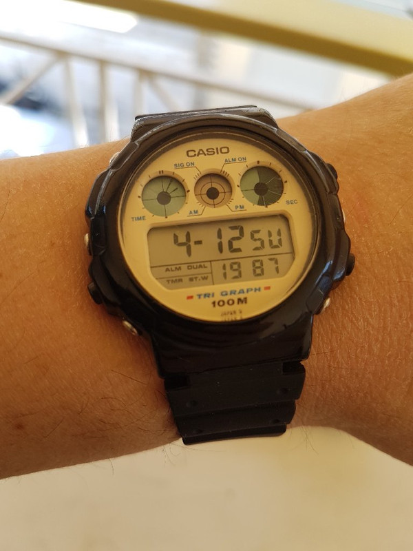Ένα αγαπημένο κομμάτι της δεκαετίας του '90 αρκετά σπάνιο με άσπρο dial.Το ρολόι αυτό έγινε beater για κάποιο διάστημα κ δεν το αποχωριζόμουν ποτέ. Αν κ αυτή η σειρά της Casio είχε "θέμα" με τις κάσες τα 2 tri-graph που έχω παραμένουν σε αρκετά καλή κατάσταση με μία ελαφριά γυαλάδα στις κάσες τους.Λογικό μετά απο τόσα χρόνια κ με χρήση στην θάλασσα. Οι φλάτζες τους θέλουν αλλαγή αλλα δυστυχώς δεν μπορώ να βρώ.Γι'αυτό κ πλέον δεν βρέχονται. Το δικό μου είναι απο τα πρώτα μοντέλα που βγήκαν κ είναι κατασκευασμένο στην Ιαπωνία με το πρώτο module το 827. Δυστυχώς η χρονολογία σε αυτό δεν πάει πάνω απο το 2019. Έτσι για να είναι σωστά τα υπόλοιπα κ κυρίως η μέρα το ρύθμισα στο 1987 όπως φαίνεται κ στην φωτό. Το ρολόι αυτό είναι δώρο απο ένα αγαπημένο μου πρόσωπο το 1999. Ποτέ δεν σταμάτησε να δουλεύει κ είναι σημαντικό κομμάτι της συλλογής μου.