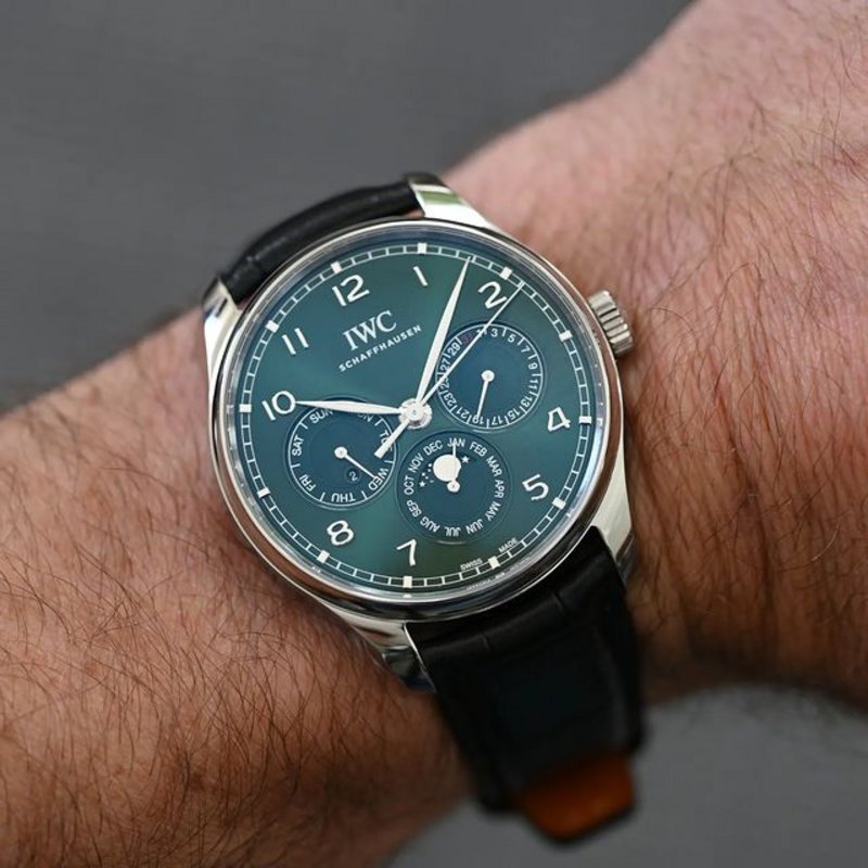 Even dressed in trendy green, the classical @iwcwatches Portugieser Perpetual Calendar 42 looks exquisite. All signature Portugieser elements are present, with the Calendar indications evenly spread out around the dial
