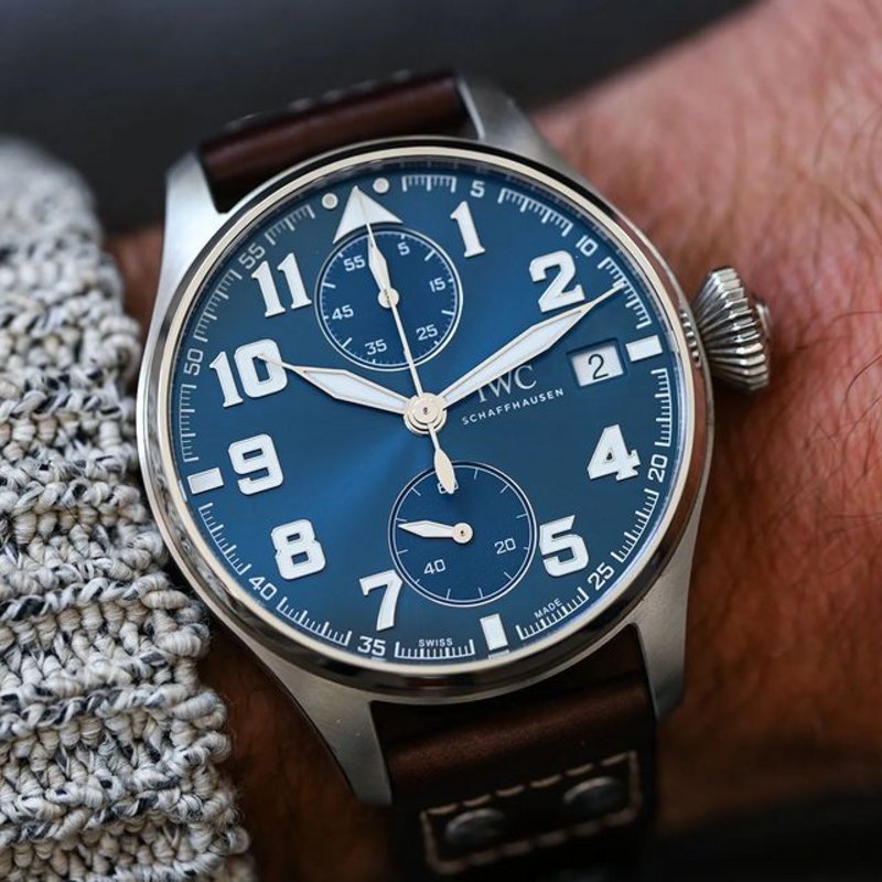 Mr Porter’s take on the Big Pilot 43 is more modern and slightly more elegant than the Spitfire Bronze. Still, the specifications are well known, with a sandblasted finish for the case, a screw-in crown, an anti-reflective sapphire crystal and a soft-iron inner cage against magnetism – something the classic models with see-through casebacks don’t have. The water-resistance is comfortable at 100m. The height of the case is, however, quite noticeable, at 14.4mm. And the length of the case, well over 50mm, requires a solid wrist or the deliberate choice of an oversized look – but, of course, less than a classic 46mm BP watch.