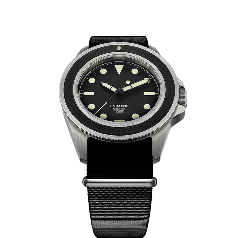 Classic. It says it right there in the name. And with spartan use of Arabic numerals on its matte black dial, a black NATO strap, and a single lumen dot on the black aluminum bezel insert, the Unimatic UC3 Classic does qualify. Pale green Super-LumiNova C3 markings ensure legibility, which is necessary when taking advantage of the 40mm brushed stainless steel case's 300m water resistance. It's powered by a Seiko Meca-quartz movement, which runs the phantom ladder hour and minute hands as well as the sweeping lollipop second hand. Made in Italy, each watch is individually numbered and arrives in a Unimatic Tough Case with slots for both it and another watch.