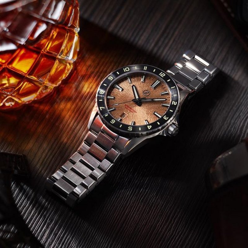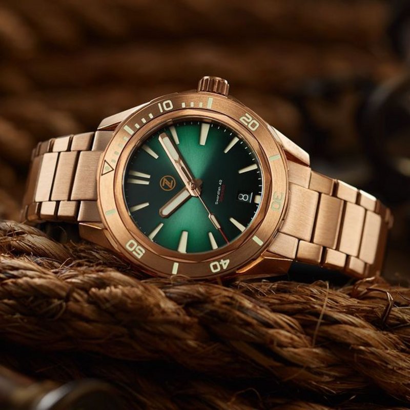 The bronze Swordfish 40mm featuring an all new dual material bracelet.A CUSN8 exterior for a warm patina and steel underside to prevent your wrist from turning green