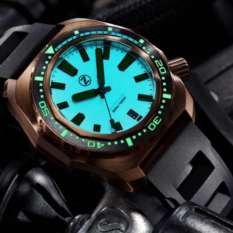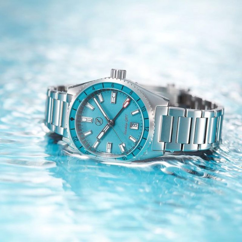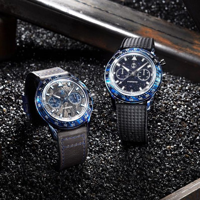 The Starfighter in ZircTi drops tonight with only 25 pieces of each variant. ZircTi is a complex alloy of Zirconium and Titanium that has been forged together. Each case is hand torched to showcase the vibrant blue (Ti) and black (zirc) layers