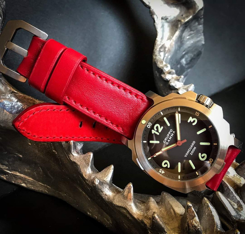 Silver color hour and minute hands and red seconds hand, with Swiss Super-LumiNova vintage color