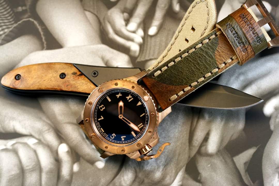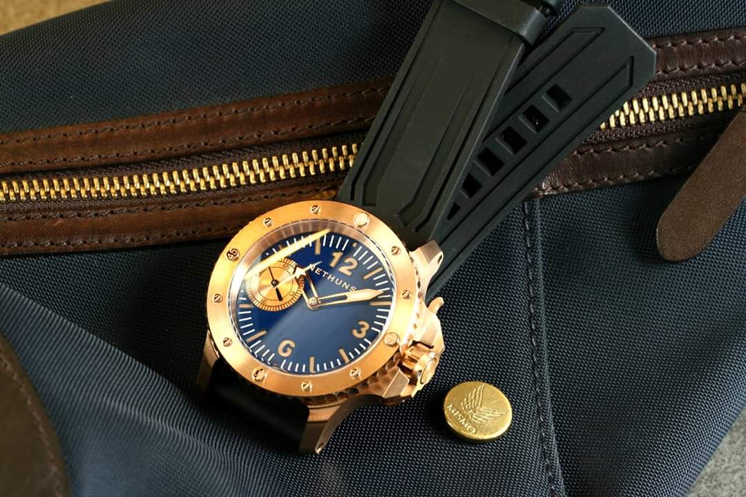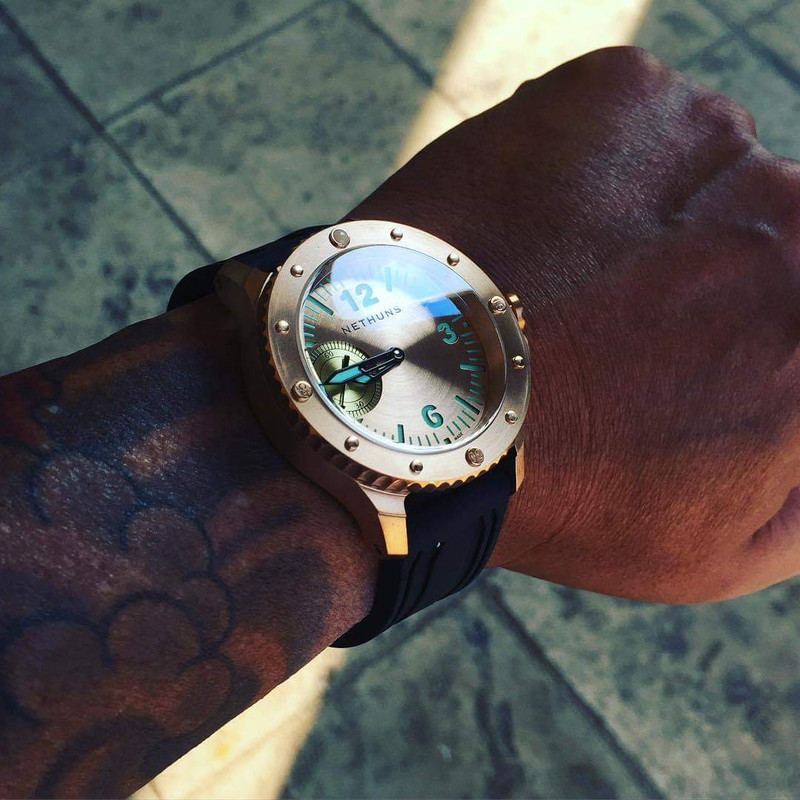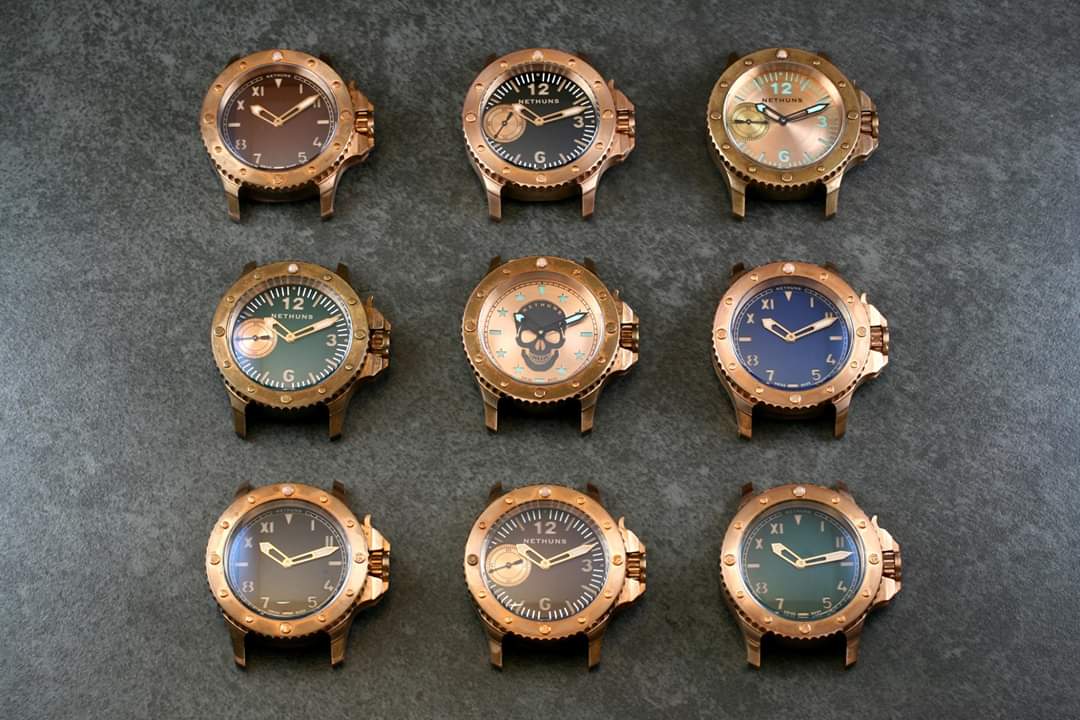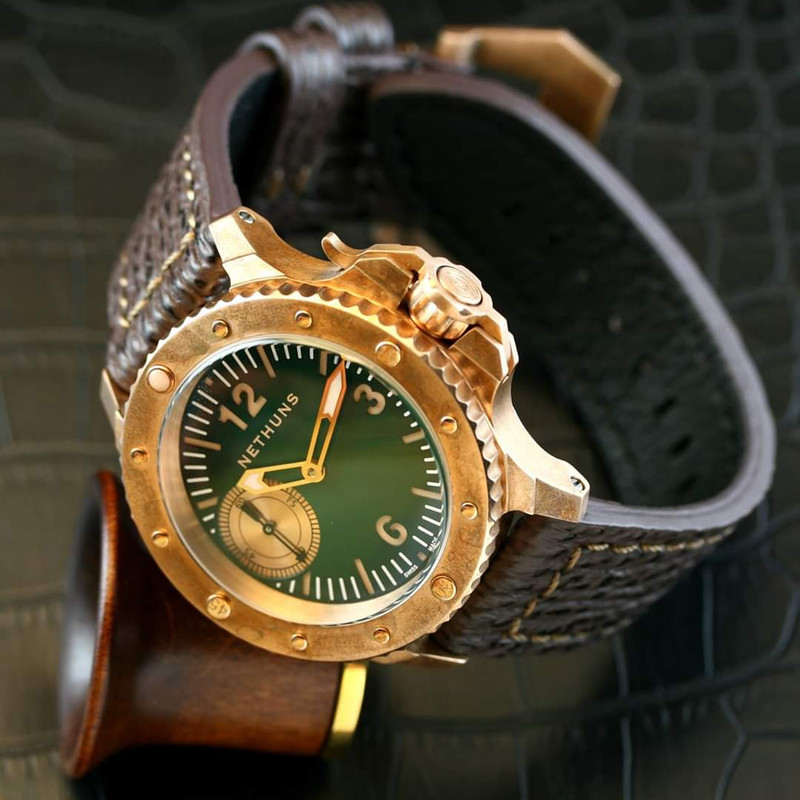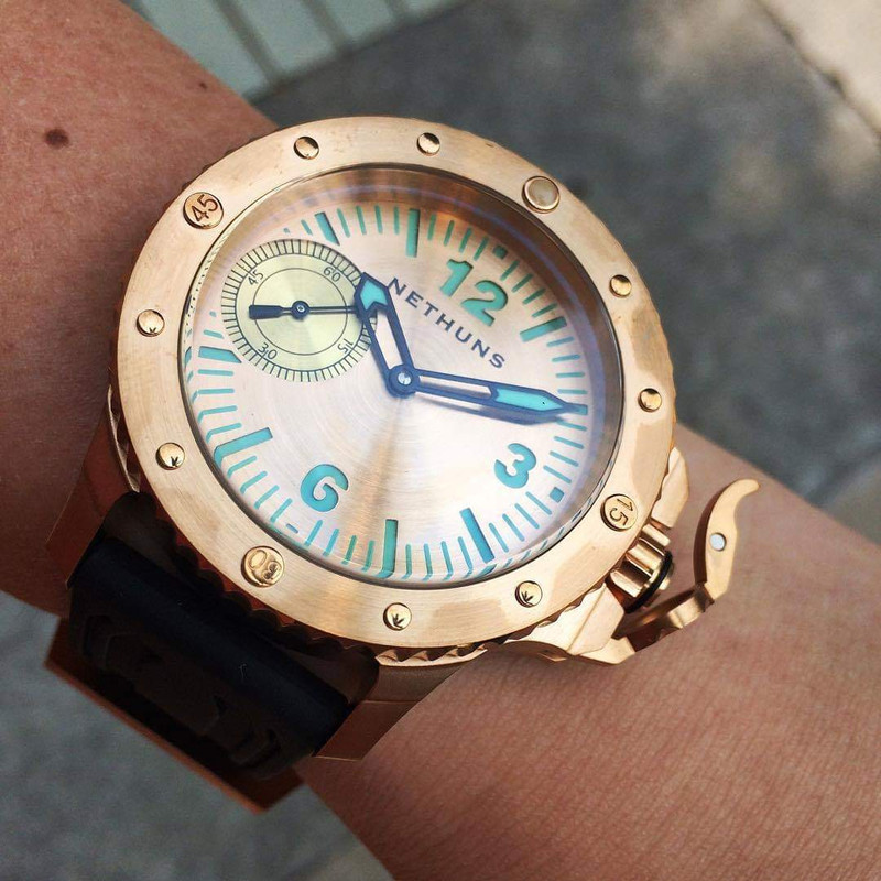 Σε παρόμοιο στυλ, τίμιο στα χρήματα του (750€) με CuSn8 bronze κάσα, κρύσταλλο ζαφείρι, κουρδιστη ΕΤΑ 6497, επιλογή dial σε διάφορα χρώματα, με ή χωρίς subdial, το Nethuns No5