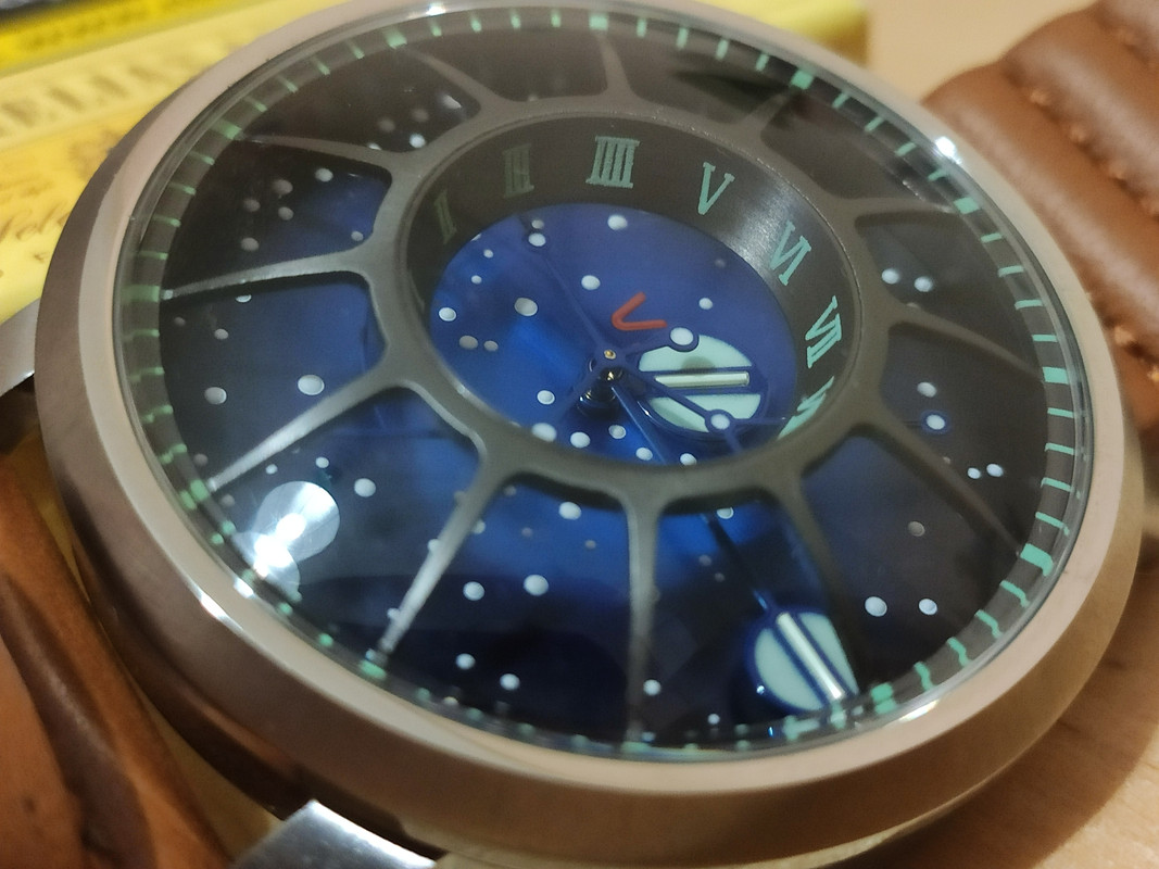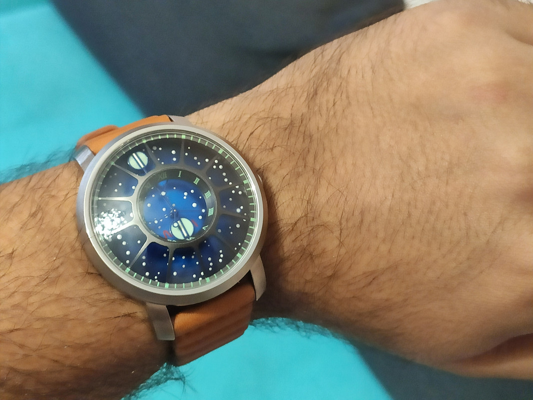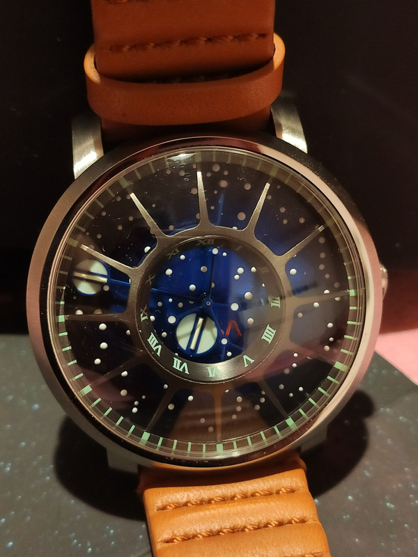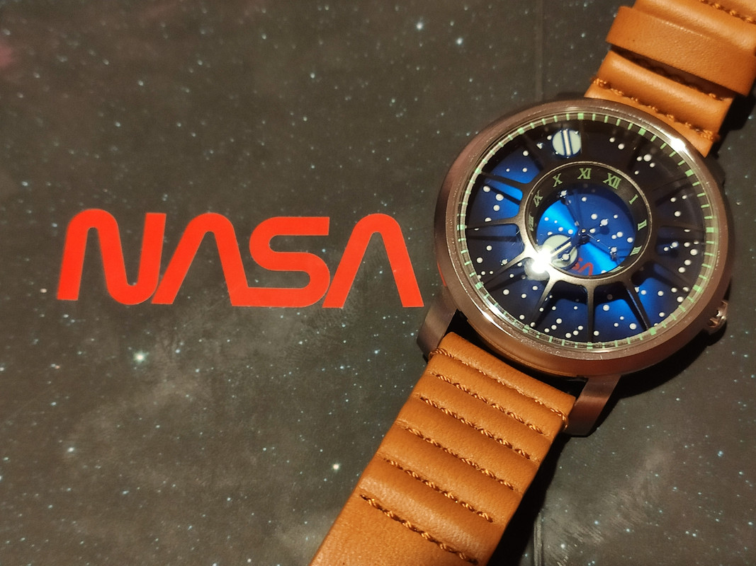 Μιας και είπαμε moon watch είναι ευκαιρία να περάσουμε στο κυρίως πιάτο, το dial. Όχι, δεν είναι moonwatch αλλά αντλεί έμπνευση από το διάστημα για το σχέδιο του. Μάρκετινγκ τρικς βέβαια αλλά αυτό είναι άλλη κουβέντα. Φάτσα κάρτα λοιπόν το λογότυπο της Nasa να φωνάζει ότι είναι official η δουλειά και η nasa εγκρίνει το ρολόι. Όλο το dial προσπαθεί λοιπόν να σε πείσει ότι βλέπεις το διάστημα μέσα από τον διαστημικό σταθμό. Η κατασκευή πάνω από το dial μιμείται το παράθυρο (σίγουρα δεν το λένε παράθυρο) του διαστημικού σταθμού. Πάνω σε αυτό μπορούμε να δούμε ότι υπάρχουν οι ώρες με λατινική αρίθμηση. Στη πραγματικότητα είναι πιο εύκολο να δεις την ώρα απ όσο νομίζεις. Σε αυτό βοηθάνε τα tritium tubes αρκετά μιας και οι δείκτες είναι... στρογγυλοι και τα tritium tubes σε βοηθάνε να κεντράρεις που δείχνει ακριβώς. Όσοι ξέρουν αστρονομία θα διακρίνουν το σύστημα trappist-1 κοιτώντας το ρολόι, προσωπικά δεν έχω ιδέα. Μου αρέσει που ξέρω ότι δείχνει κάτι που όντως υπάρχει και το επετειακό της όλης υπόθεσης αλλά δεν είμαι space geek. Και στη τύχη να ήταν οι κουκκίδες δεν θα με πείραζε.