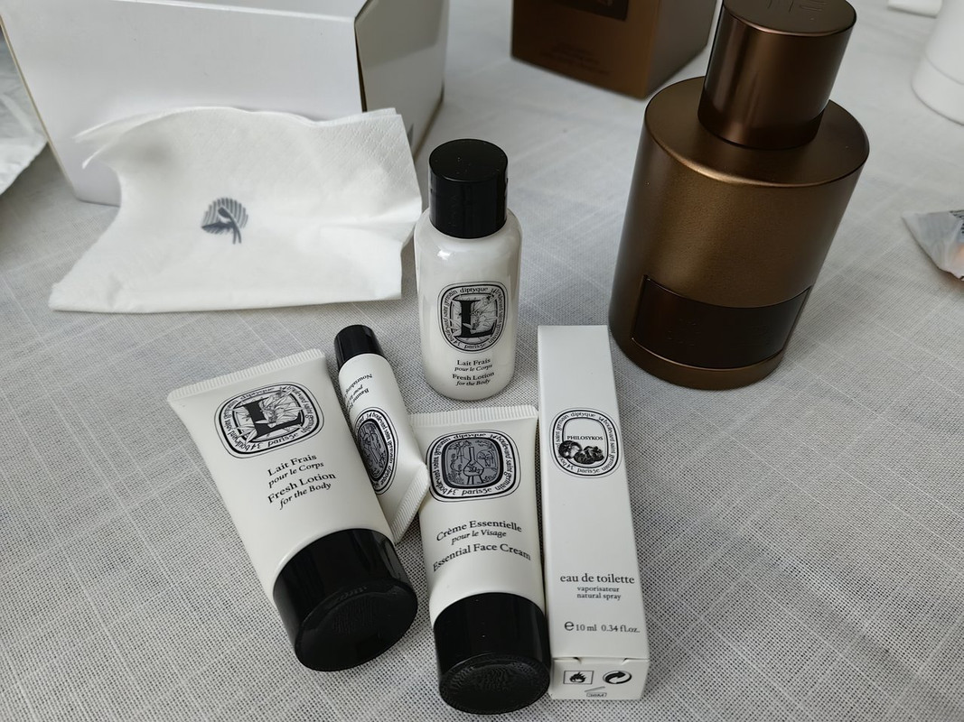 Diptique items από το amenity kit QR J SIN-DOH, συν το Oud Minerale (EdP) του Tom Ford: