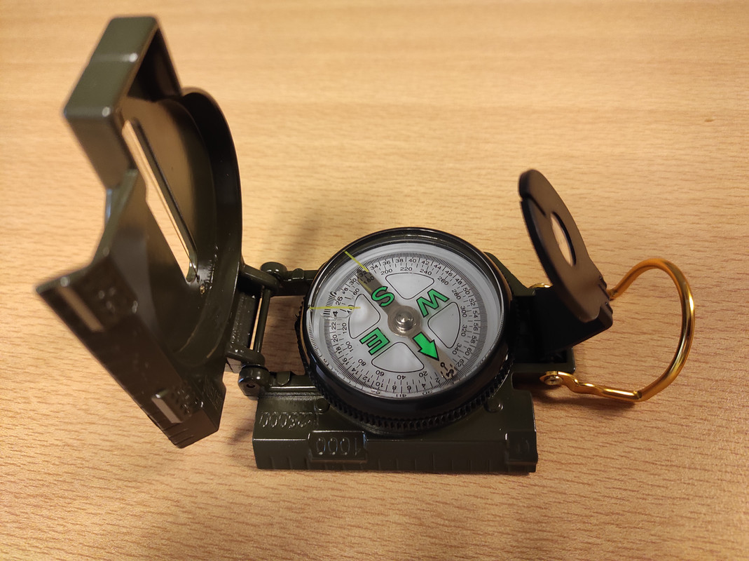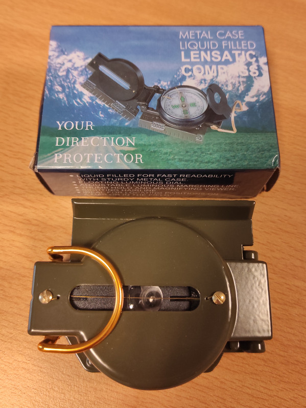 Σημειωτέον, ότι αυτή είναι αντίγραφο στρατιωτικής πυξίδας, και στην πρωτότυπη έκδοση, έχει και αλφαδάκι, για να έχεις πάντα οριζόντια θέση στις διοπτεύσεις.
