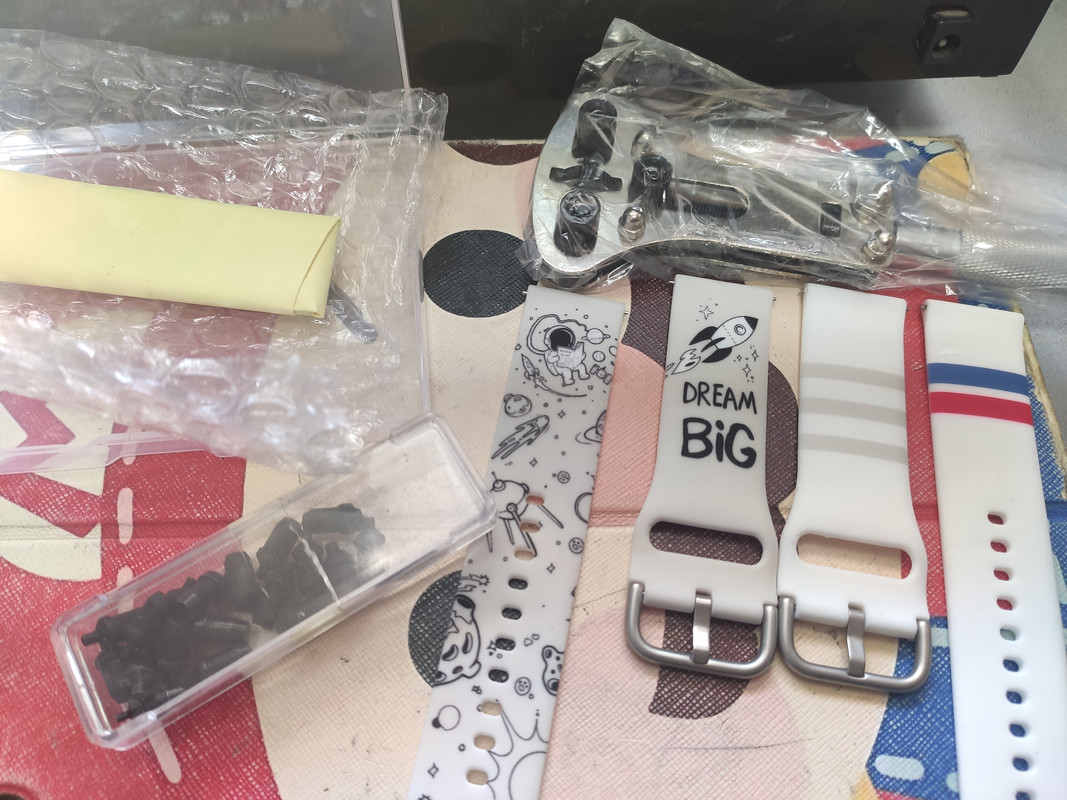 2 λουριά που δεν έχω ιδέα τι θα τα κάνω αλλά έχουν πλάκα, caseback opener και αυτό που είναι τυλιγμένο με χαρτί είναι rodico