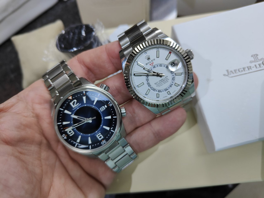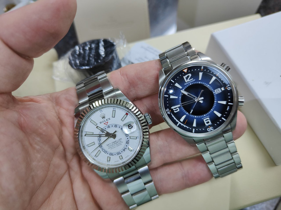 Το JLC με το μπρασελέ είναι σαφέστατα πιό ελαφρύ από το SkyD, θα τα ζυγίσω από αύριο αλλά ούτως ή άλλως είναι και διαφορετικά σε complications οπότε η κάθε σύγκριση είναι παρακινδυνευμένη, την κάνουμε τώρα τη σύγκριση απλά γιατί αυτά έχουμε εδώ