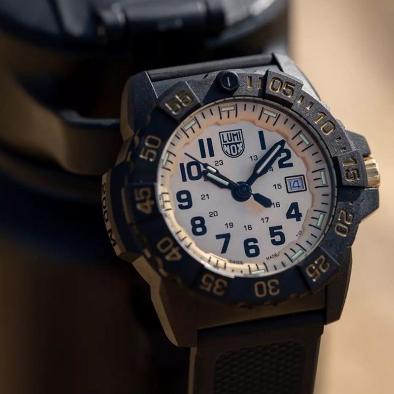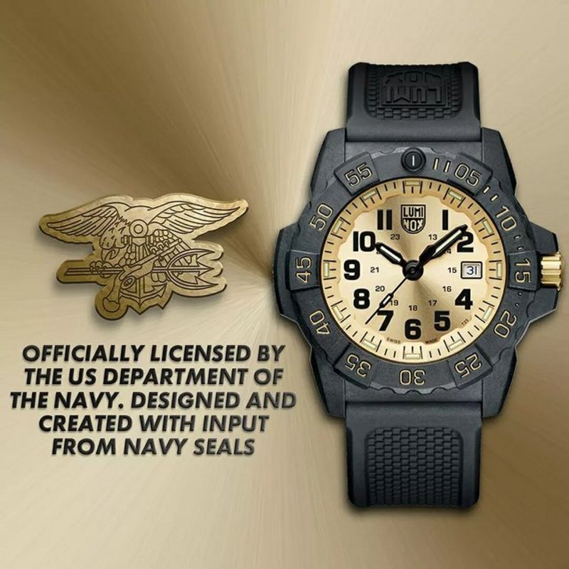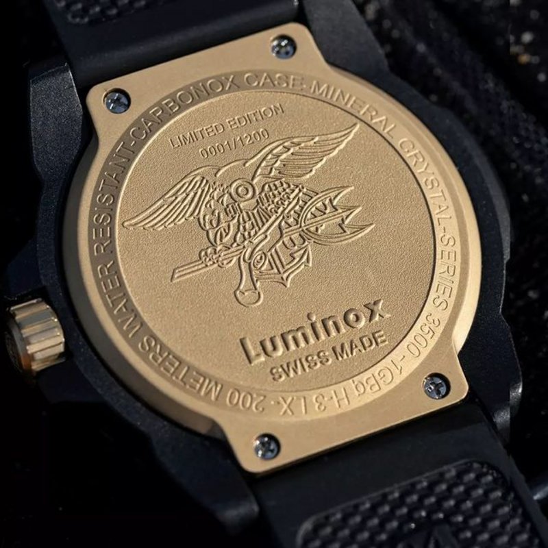 The Navy SEAL Gold Limited Edition is part of Luminox’s SEA series, with water resistance to 200 meters, a 45mm CARBONOX+™ case with a stainless steel caseback, on which the Navy SEALs logo & the limited-edition number is engraved