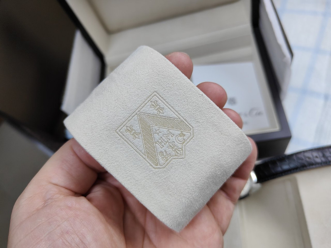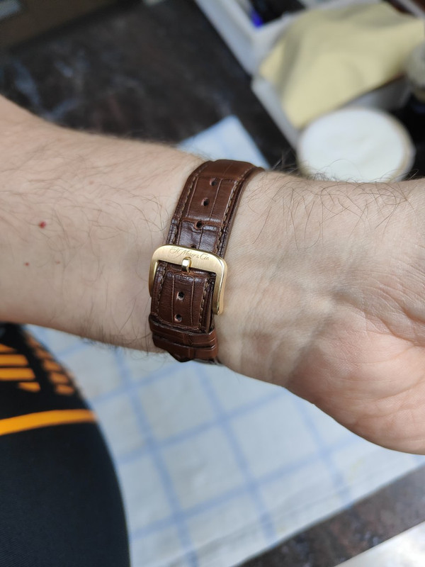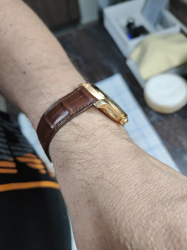 To pin buckle είναι απλό αλλά πάρα πολύ καλά σχεδιασμένο και δομημένο, με ικανότατο πάχος, full red gold βέβαια, με recess (αν θυμάμαι καλά τώρα...) για να κάθεται σωστά το λουρί και να μην πιέχεται ο καρπός περισσότερο, όπως στα A. Lange & Söhne δηλαδή.