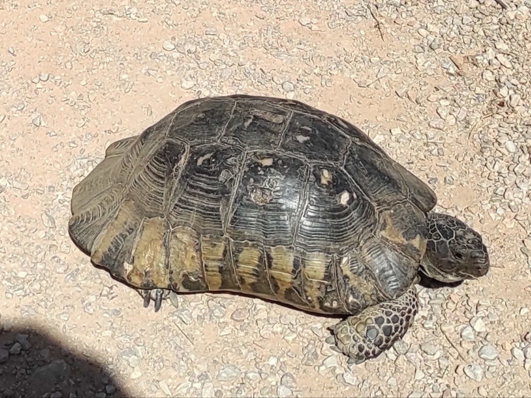 Το ταλαιπωρρημένο, φαίνεται από το καβούκι του, που έχει και κτύπημα, στην μεγάλη κεντρική φολίδα, αλλά και πολλά ξεφτίσματα, της εξωτερικής στοιβάδας του, από το κεφάλι, μέχρι και τα πίσω πόδια.