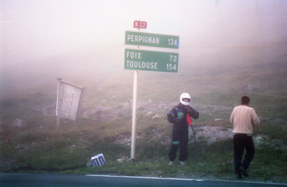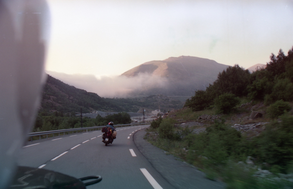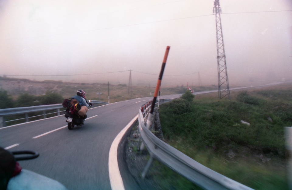 Διακρίναμε πολλά χιλιόμετρα νωρίτερα ότι προσανατολιζόμασταν προς ένα σύννεφο που είχε τυλίξει το δρόμο. Μετά από αρκετά λεπτά βρεθήκαμε να το τρυπάμε με το θράσος της άγνοιας. Μέσα σε λίγα λεπτά η ορατότητα έπεσε στα 2-3 μέτρα, ήταν πραγματικά τρομακτικό. Αν απομακρυνόμουν περισσότερο από 3 μέτρα από το κολωφάναρο του Βαγγέλη δεν έβλεπα τίποτα και τα απέναντι αυτοκίνητα είχαν κόψει –ευτυχώς- τη ταχύτητα τους, παρόλα αυτά εμφανιζόντουσαν σαν φαντάσματα απότομα μπροστά μας.