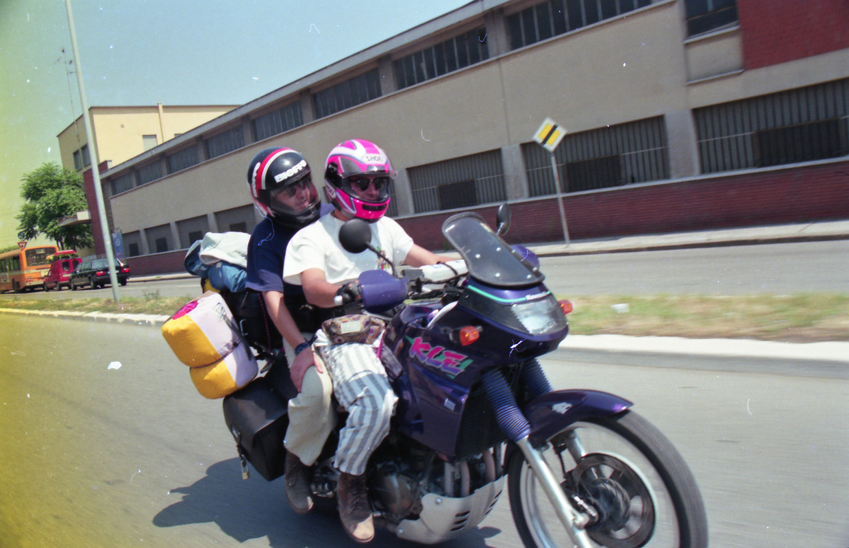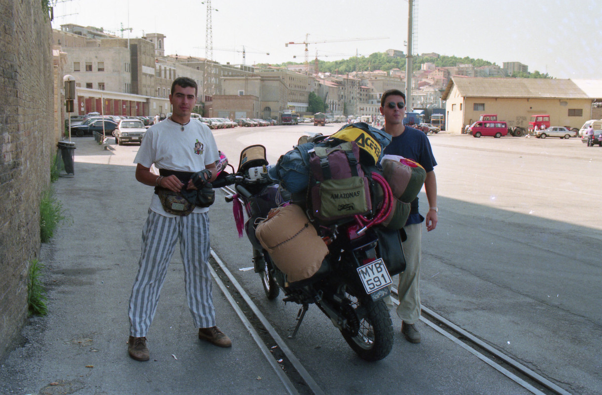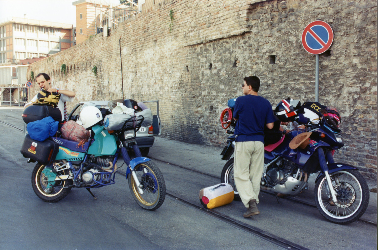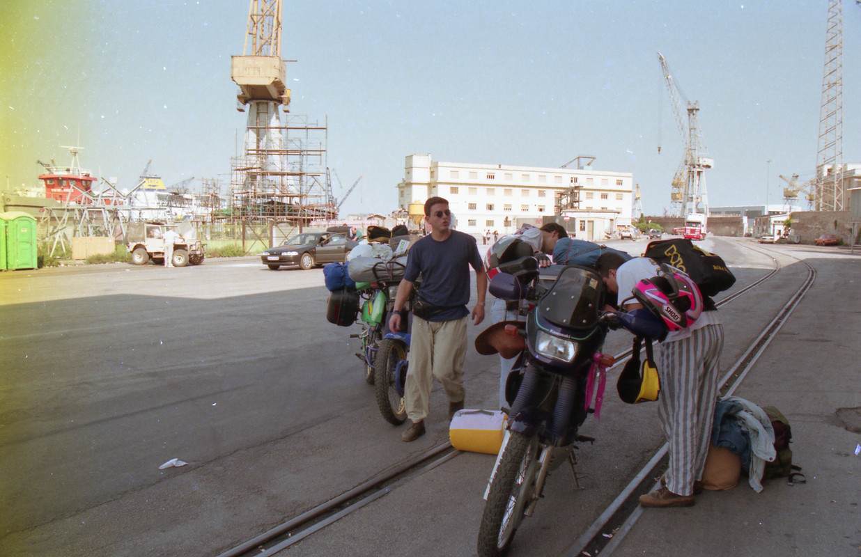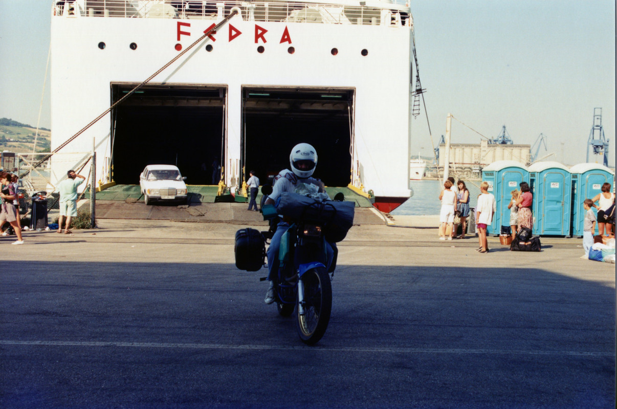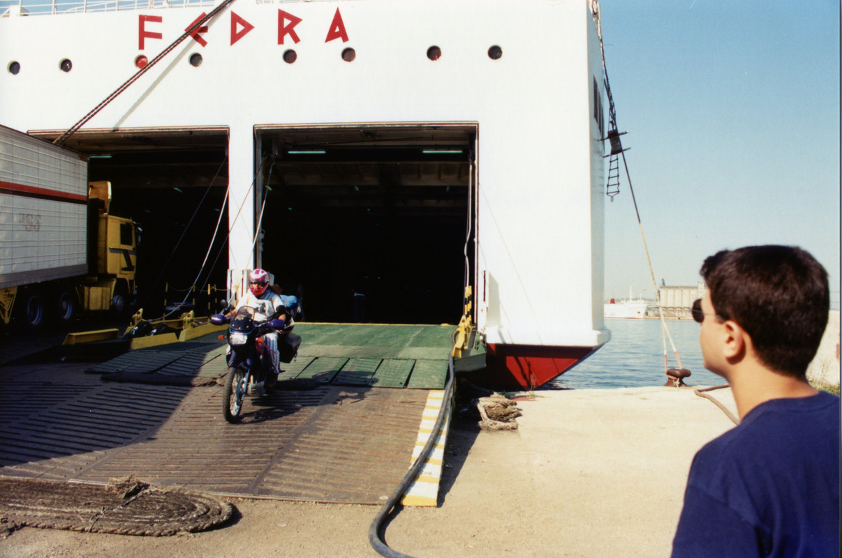 Πέντε μέρες μετά όλα αυτά είχαν γίνει παρελθόν… ξημέρωνε η μεγάλη μέρα. Στις 6 το απόγευμα το πλοίο θα σαλπάριζε από το λιμάνι της Πάτρας με προορισμό την Αγκόνα, αφού νωρίτερα είχε πιάσει Κέρκυρα και Ηγουμενίτσα. Φορτώσαμε τις μηχανές και ξεκινήσαμε να «μαζέψουμε» τους δυο συνοδοιπόρους μας, όμως... κάτι δεν πήγαινε καλά... αυτή η μηχανή δεν ήταν η δική μου, ήταν μια άλλη μηχανή, βαριά... πολύ βαριά! Και το πράγμα χειροτέρεψε όταν ο Γιώργος Μ. Κρατούσε στο χέρι ένα επιπλέον σακίδιο που ήταν εκτός προγράμματος. Το σταντ της μηχανής δεν κατέβαινε, ήταν αδύνατο να εκταθεί πλήρως καθώς η διαδρομή της ανάρτησης ήταν εξαντλημένη από το φορτωμένο βάρος και η διαδικασία στηρίγματος της μηχανής ήταν... πως να το πω... ανέφικτη!