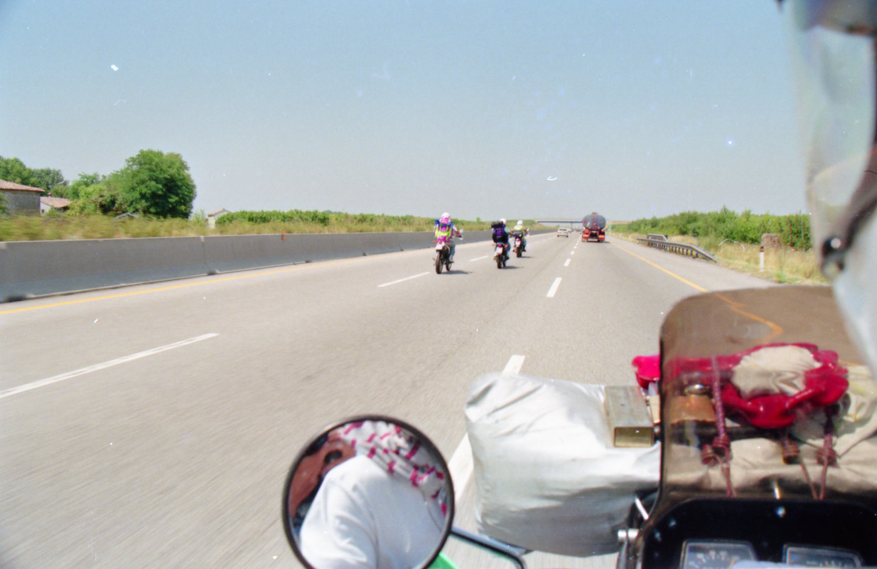 Είχαμε ανταλλάξει τους συνεπιβάτες μας σε μια προσπάθεια να εκτονωθεί η ένταση. Ένα διαρκές μουρμούρισμα –αφόρητα ενοχλητικό- έβρισκε δρόμο προς τα έξω μέσα από τη κλειστή ζελατίνα του κράνους του νέου μου συνεπιβάτη. Κάποια στιγμή πέσαμε σε κάποιον που μας έμοιαζε για Γάλλος και τον ρωτήσαμε αν μπορούσε να μας συστήσει κάτι αξιοπρεπές και φθηνό για διανυκτέρευση. Μας συμβούλευσε να απευθυνθούμε στο Αστυνομικό τμήμα που ήταν εκεί κοντά.