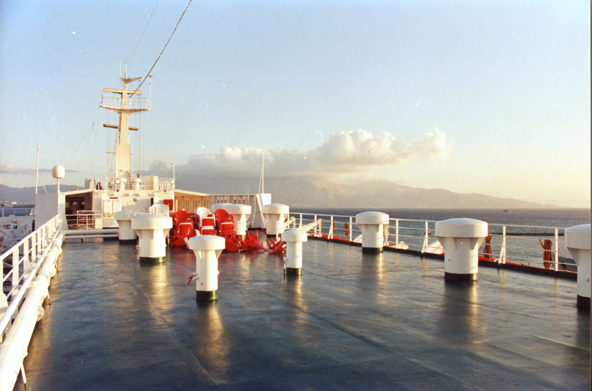 Παρά την ημίωρη καθυστέρηση φτάσαμε στο λιμάνι της Πάτρας στην ώρα μας. Περάσαμε από τους απαραίτητους ελέγχους των εγγράφων μας και μπήκαμε στο γκαράζ της FEDRA. Πήραμε τους υπνόσακους και βουρ στο κατάστρωμα για καμιά καλή γωνιά.