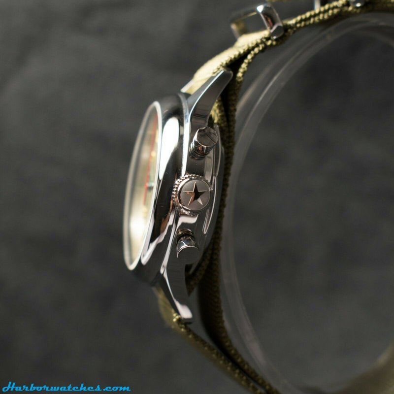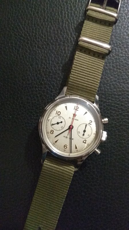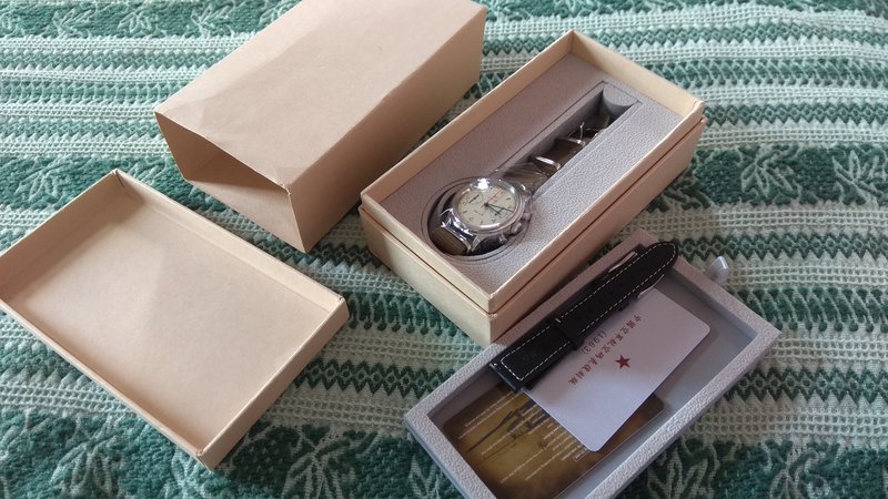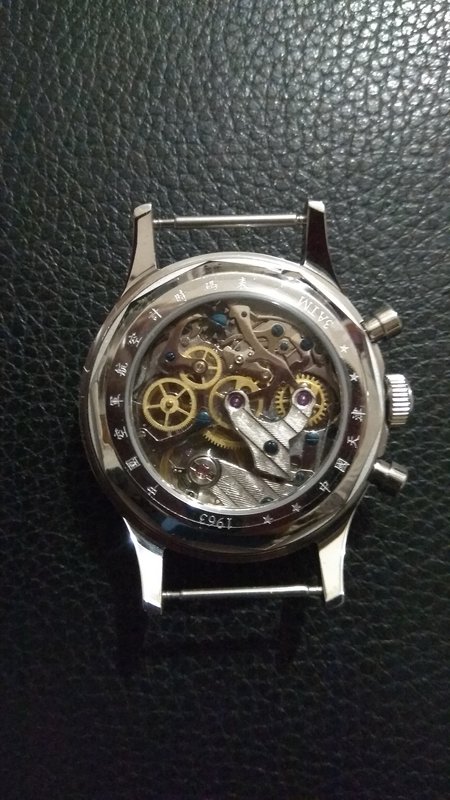 Πήρα το 38άρι με ζαφείρι και την κρεμ πλάκα με ανοικτά τα οπίσθια για να φαίνεται ο μηχανισμός. Φυσικά είναι κουρδιστό με 21 zuan, συγνώμη ρουμπίνια. Οι δείκτες έχουν ένα μπλε χρώμα και ο δευτρολεπτοδείκτης του χρονογράφου κόκκινο όπως κόκκινο είναι και το ανάγλυφο πεντάκτινο αστέρι με χρυσή περίμετρο κάτω από την θέση 12. Κάτω από το αστέρι γράφει 21 zuan. Στην θέση 6 έχει κάτι κινέζικα. Στο αριστερό υποκαντράν δείχνει τα δευτερόλεπτα της ώρας και το δεξί τα λεπτά του χρονογράφου. Χρυσαφί και ανάγλυφες είναι και οι ενδείξεις της ώρας με το 12-2-4-6-8-10 να απεικονίζονται με αριθμούς και τις υπόλοιπες ώρες με τρίγωνες ενδείξεις με τις ακίδες των τριγώνων να κοιτούν στον κεντρικό άξονα.