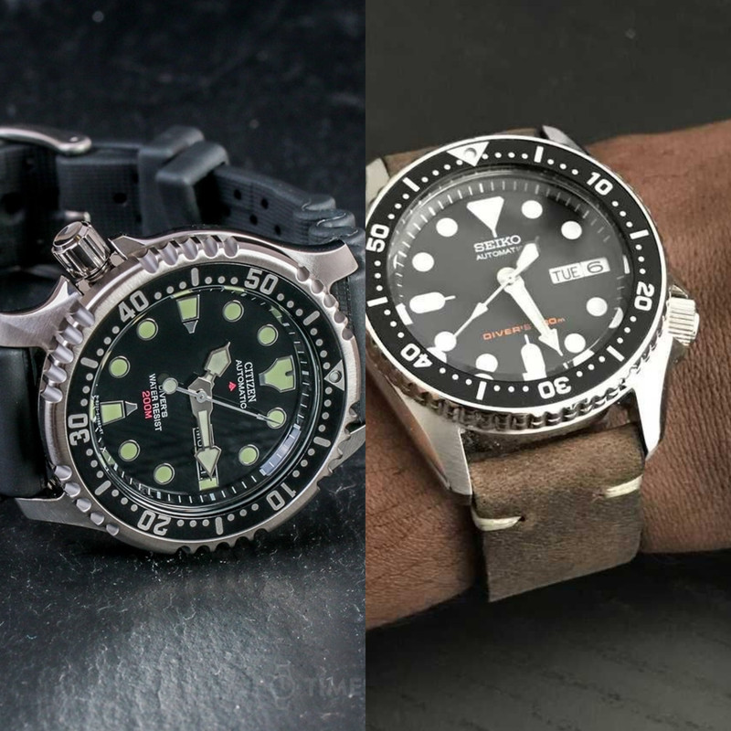 Πιστοποιημένοι δύτες και τα δύο, αυτό που λέμε tool-watches. Τα βάζεις στο χέρι και κάνεις τα πάντα, από θάλασσα με το μαγιό μέχρι γάμο με κοστούμι (εντάξει στο γάμο με το μπρασελέ όχι με το λάστιχο). Έχουν ιστορική βαρύτητα και τα δύο, το Seiko είναι η συνέχεια των skin divers της εταιρείας, το Citizen είχε φορεθεί από τα κομαντα της γειτονικής Ιταλίας πριν 2 δεκαετίες. Σχεδιαστικά το Citizen υστερεί σημαντικά σε σχέση με το Seiko. Μπορεί αυτό να είναι υποκειμενικό αλλά κανείς δεν μπορεί να αρνηθεί πως δείχνει πως είναι ρολόι του '90, ενώ το Seiko διαθέτει κλασικότερο σχέδιο, θα μπορούσε να χαρακτηριστεί timeless, κάτι σαν το sub τηρουμένων των αναλογιών. Μηχανικά είναι τα ίδια. Απλά το Citizen διαθέτει κούρδισμα από την κορώνα, πράγμα άχρηστο για δύτη. Κάπου διάβασα πως τα φρέσκα τα βγάζει και με hacking, πράγμα επίσης άχρηστο σε μηχανές που μπορεί να αποκλίνουν 20s τη μέρα.