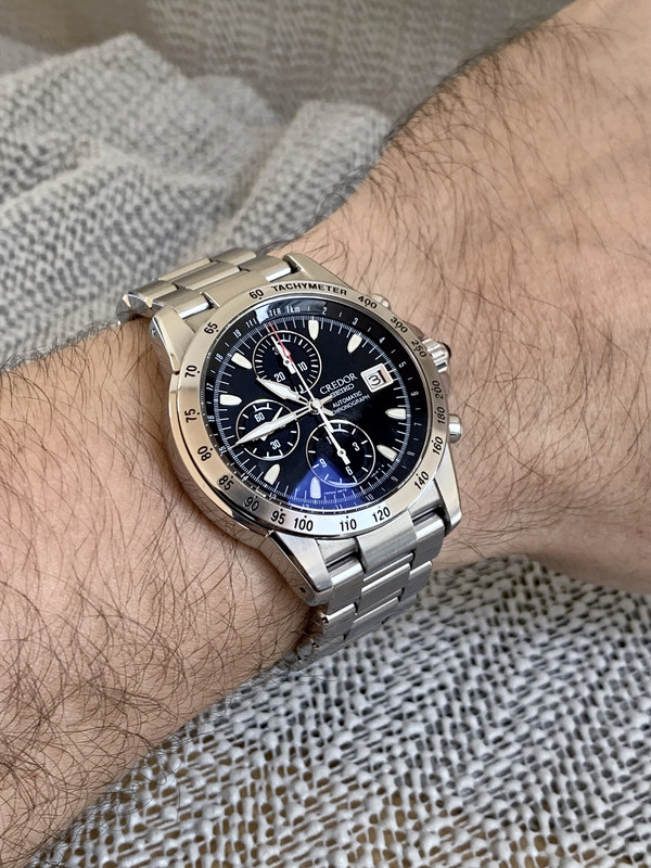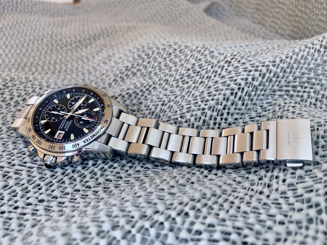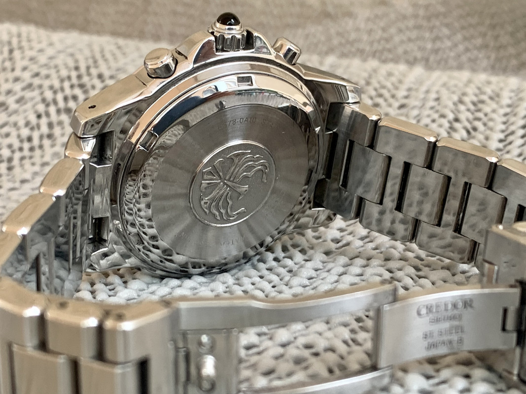 Έχει drilled lugs, κάτι που λατρέυω σε σπορ ρολόγια. Στη συγκεκριμένη περίπτωση είναι κάπως άχρηστα, καθώς έχει σταθερό endlink, οπότε δεν παίρνει λουράκια. Δε θα του έβαζα έτσι κι αλλιώς, το μπρασελέ του χαίρεσαι να το φοράς. Αρχίζει με 20m, καταλήγει στα 18 και το πάχος του είναι 4mm. Στο κούμπωμα πεταλούδα έχει το λογότυπο Credor. Σταθερό, ποιοτικό, αθόρυβο κούμπωμα, χωρίς κανένα micro adjustment όμως.