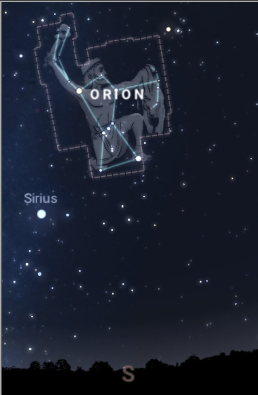 ...και κάτω αριστερά του, οι σκύλοι του κυνηγού, Canis Majoris - Μεγάλου Κυνός με τον πιο φωτεινό αστέρα του ουρανού, τον Σείριο.