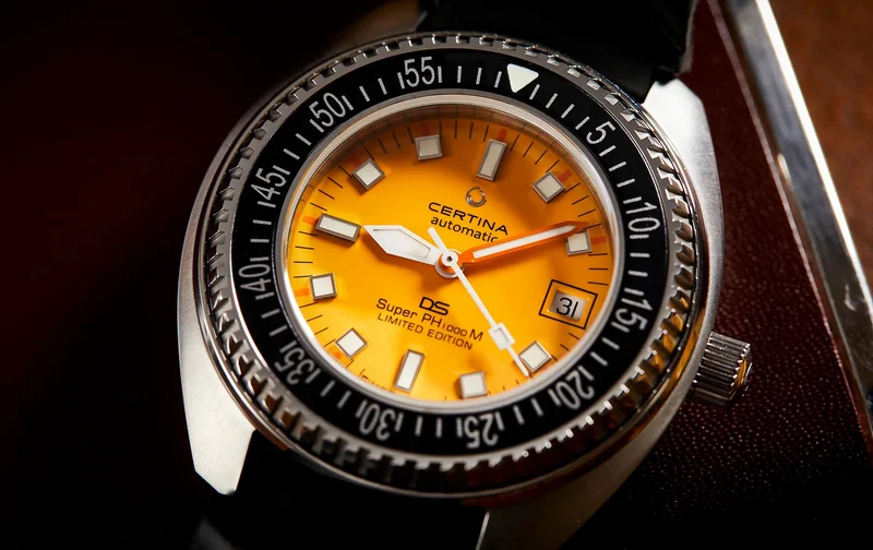 Certina DS Super PH1000M OrangeDiameter: 43.5mmWaterproof: 1000mMovement: Powermatic 80Power reserve: 80 hoursExtra: Limited to 1000 piecesPrice: 900 CHF