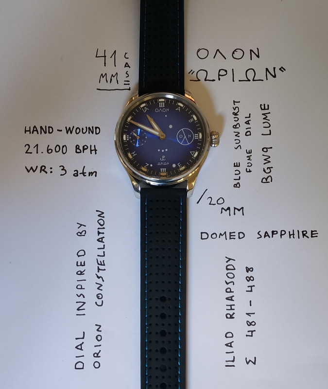 Το ρολόι είναι εμπνευσμένο από τον αστερισμό του Ωρίωνα και σε συνδυασμό με τα αρχαία Ελληνικά στοιχεία στο dial είναι προσαρμοσμένο στην αισθητική της εταιρείας "ΟΛΟΝ"