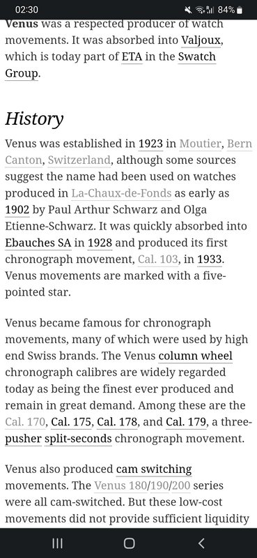 Old stock of Venus movements has been depleted in recent years, leading to a run-up in prices for watches with these movements. Jaquet SA became expert at refinishing Venus calibres and, under new name La Joux-Perret, has built up capability to re-create parts and even entire movements if needed