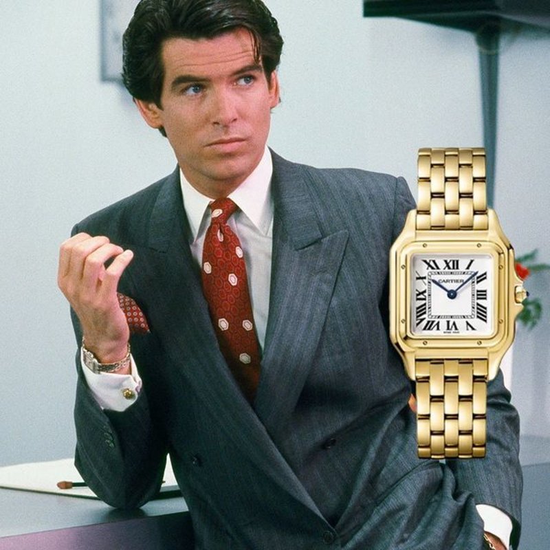 Small watches are finally coming back in style, and we couldn't be happier about that. Often considered a female watch, the Cartier Panthère begs to differ. ⁠ ⁠ In 1987, Pierce Brosnan sported a stunning gold @cartier Panthère on the brand's Figaro bracelet, when he portrayed the dashing, upper-class detective Remington Steele