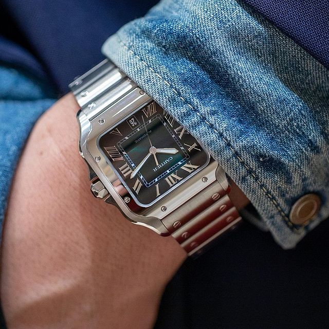 Santos de Cartier New 2023: Santos, of course, with eight exposed screws on the bezel, Roman numerals on the dial, a railway minute track, and classic Cartier sword-shaped hands, set with a faceted sapphire cabochon. The heptagonal crown remains the same. The new metallic graduated green dial shines from all sides as all parts are coated with a light colored lacquer