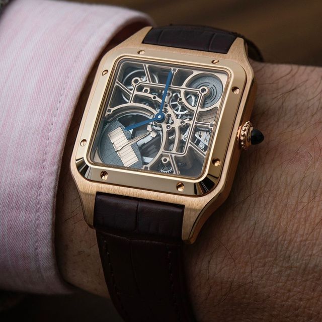 Cartier unveiled a new addition to its collection of skeleton watches, the Santos-Dumont Skeleton watch. Three variations: in steel, in rose gold and in yellow gold with navy lacquer