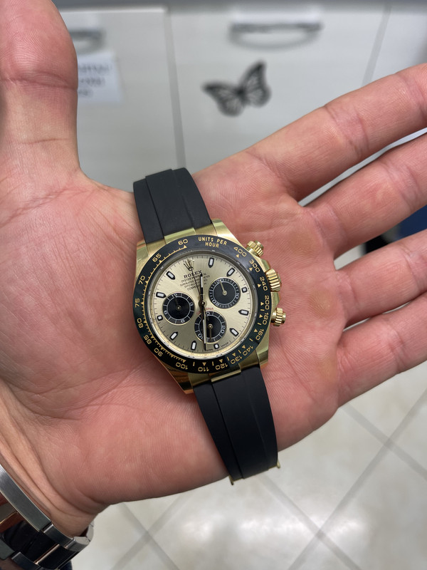 Λοιπόν Παναγιώτη, να σου πω πρώτα για την oysterflex… Το θεωρω ένα πανέμορφο ρολόι και σίγουρα την προτιμάω από οποιαδήποτε ατσάλινη η TT Daytona. Ναι είναι λίγο μικρό ρολόι αλλά όχι σε βαθμό όπως το 36αρι dj που είχες… Άσε που επειδή υπάρχει και το 41 (39 στην πράξη) σου φαινόταν πολύ μικρό όπως κι εμένα. Η Daytona όμως είναι αυτή και με το rubber το οποίο μου αρέσει πολύ σε συνδυασμό με το πολύτιμο μέταλλο, δίνει ένα sport νεανικό ύφος κάτι που κρίνοντας από το στυλ σου, σου ταιριάζει απόλυτα! Αν και λάτρης του ροζ χρυσού όλως παραδόξως για κάποιο λόγο μου αρέσει περισσότερο σε κίτρινο χρυσό η συγκεκριμένη αλλά αυτά είναι περί ορέξεως κολοκυθόπιτα!