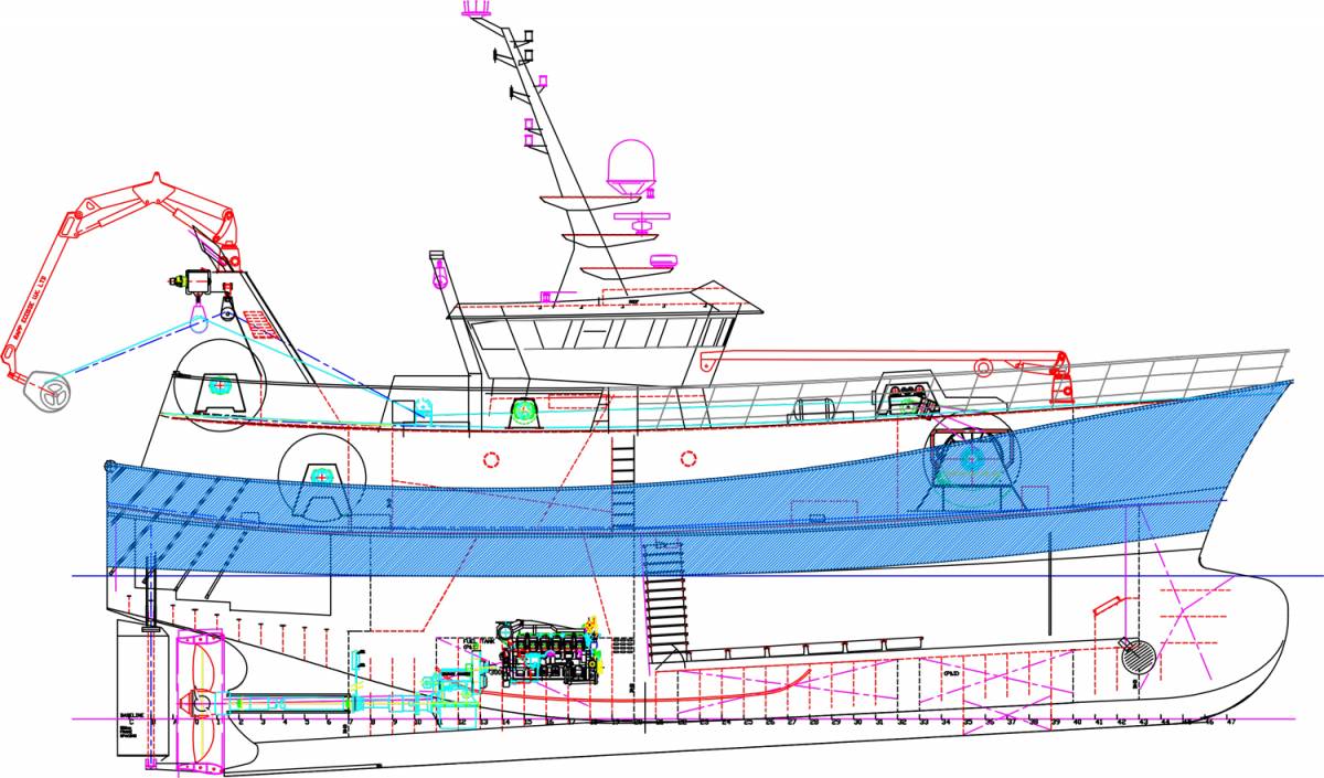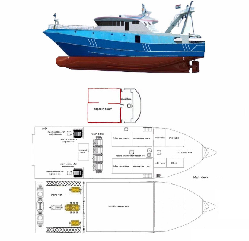 Ο γενικός σχεδιασμός ενός τέτοιου σκάφους περιλαμβάνει υψηλά έξαλα, δηλαδή ύψος από την θάλασσα, για αντιμετώπιση καιρικων συνθηκών, ελεύθερες επιφάνειες καταστρώματος, για εύκολία εργασίας, βίντσια για ανελκύσεις, καταπακτές αποθηκών ( αμπάρια - κύτος ), βοηθητικά μηχανήματα - ( εαν είναι μεγάλο ψυκτικά - παραγωγή νερού , αν είναι μικρό - αποθήκευση έτοιμου πάγου ). Τα υπόλοιπα, γεννήτρια , μηχανές, πηδάλια, συστήματα ναυσιπλοϊας κλπ, δεν αναφέρονται ιδιαιτέρως, μια και είναι κοινά.