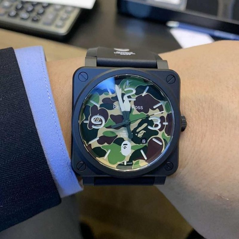 The trendy index BAPE® 25th anniversary BAPE® X BELL & ROSS joint limited edition watch is limited to 25 and 100 pieces worldwide. It is only sold at specially designated BAPE® and Bell & Ross stores