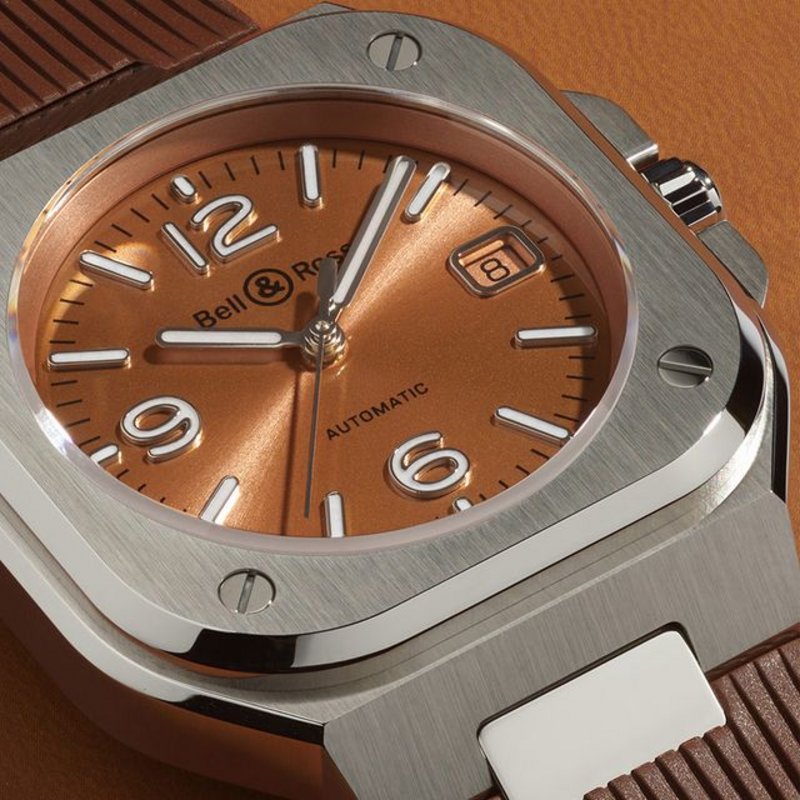 The new BR 05 Copper Brown is adorned with a golden-brown dial, enriched by a sunburst finishing which gives shine and a sense of preciousness recalling the light of the end of a summer’s day