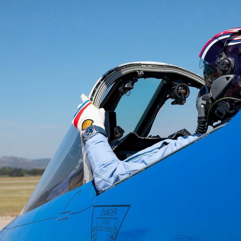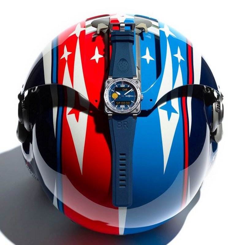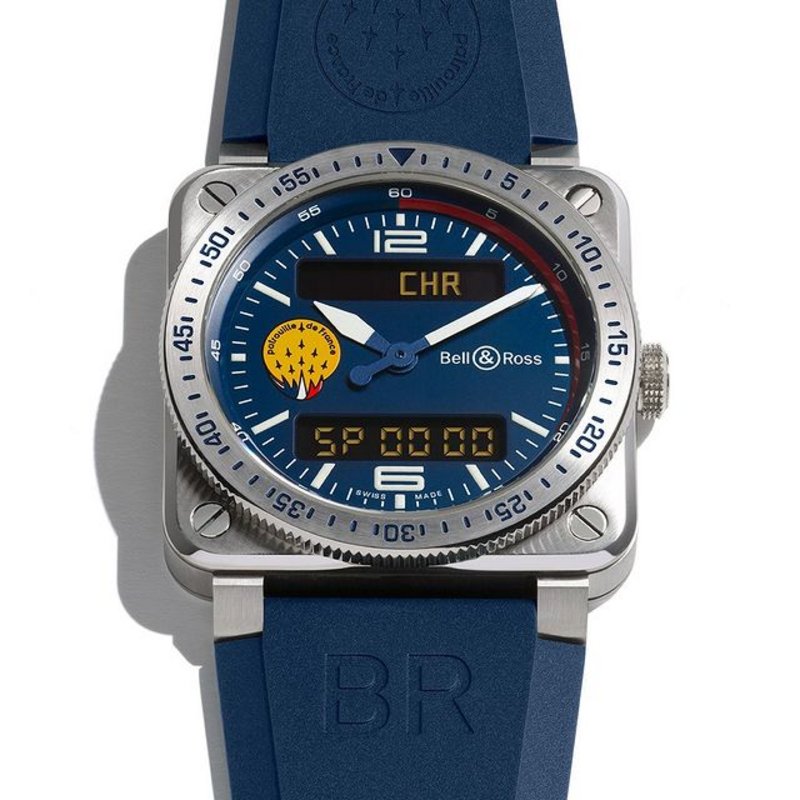 The BR 03 Type A Patrouille de France provides a large number of additional functions essential to face all circumstances: 1/100th of a second chronograph with intermediate and additional time, countdown, alarm, date and dual time zone. The window at the top of the dial displays the abbreviation of the chosen function. The second window, positioned at the bottom of the dial, digitally displays the measurement. The various functions are selected by pressing the crown