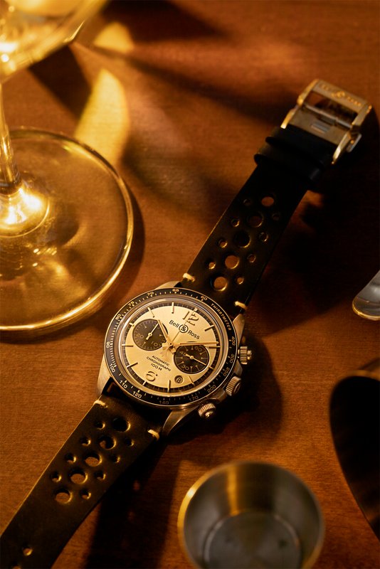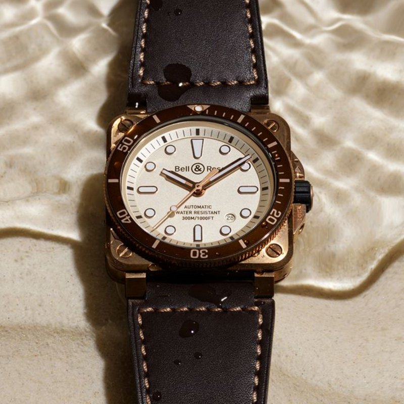 The new BR 03-92 DIVER WHITE BRONZE features a sophisticated construction of four parts assembled with screws. The one-way rotating bezel in polished bronze is fitted with a brown aluminium ring. The other details include a screw-down telescopic crown, and the soft iron cage that protects against magnetism.