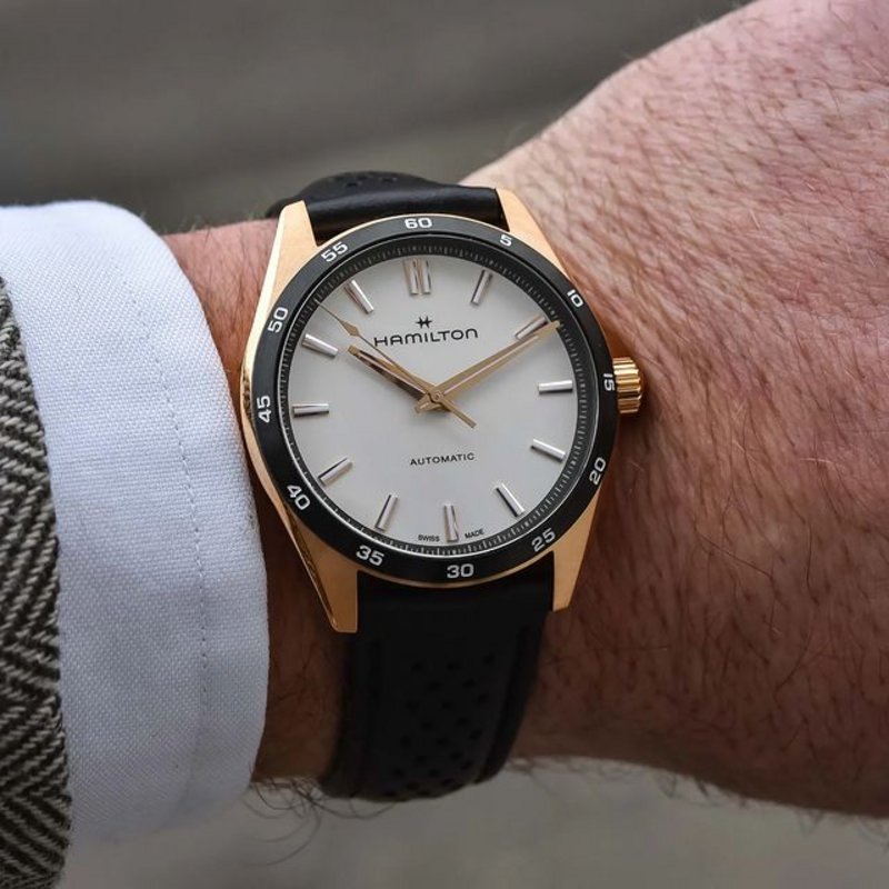 Jazzmaster Performer comes in very moderate 38mm. One of the most captivating of the trio is this gold PVD coated one, with a white dial and a bezel in black