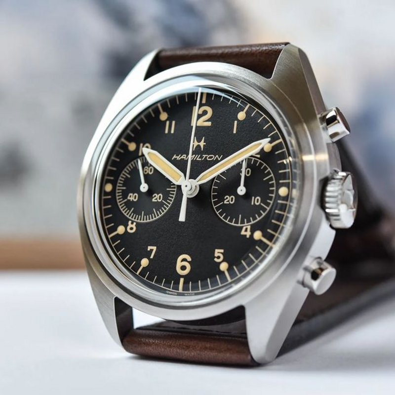 hamiltonwatch Khaki Pilot Pioneer Mechanical Chronograph. It's styled after a historical RAF Chronograph from the 1970s, known as the Fab Four. It comes with the signature asymmetric case, matte black dial with beige details, and a manual wound chronograph movement
