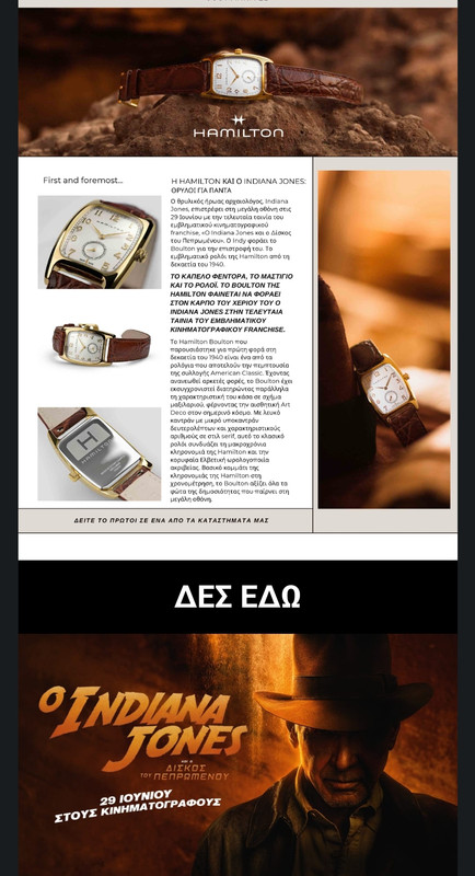 Ο θρυλικός αρχαιολόγος Indiana Jones επιστρέφει για την τελευταία του περιπέτεια στη μεγάλη οθόνη (Indiana Jones and the Dial of Destiny) και στην επιστροφή του φορά ένα από τα πλέον εμβληματικά ωρολόγια της HAMILTON, συνεχίζοντας τη συνεργασία 90 και πλέον χρόνων μεταξύ της HAMILTON και της βιομηχανίας του Hollywood. Το μοντέλο Boulton εμφανίστηκε για πρώτη φορά το 1941 και υπήρξε ένα από τα δημοφιλέστερα ωρολόγια της γενιάς του. Στη δεκαετία του 1980 επανήλθε στην αγορά με χαρακτηριστικά προσαρμοσμένα στις σύγχρονες ανάγκες, πάντοτε όμως παραμένοντας πιστό στο συνδυασμό της ελβετικής ακρίβειας και του αμερικανικού πνεύματος που το διέπνεε διαχρονικά. Μπορείτε να σκεφτείτε κάποιον καλύτερο σύντροφο στις δικές σας περιπετειώδεις αναζητήσεις;