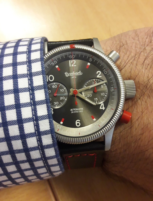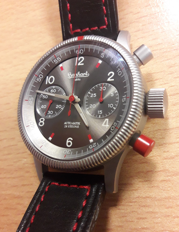 Optional stainless steel, matt sandblasted stainless steel or stainless steel with black DLC coating, anodized aluminum red button and fluted bezel with inlaid red marking, convex, internally anti-reflective sapphire glass, screwed-down, internally anti-reflective sapphire glass case back, screw-in crown with Hanhart logo, flexible lugs, diameter 44 mm, height 15 mm, water-resistant to 10 ATM