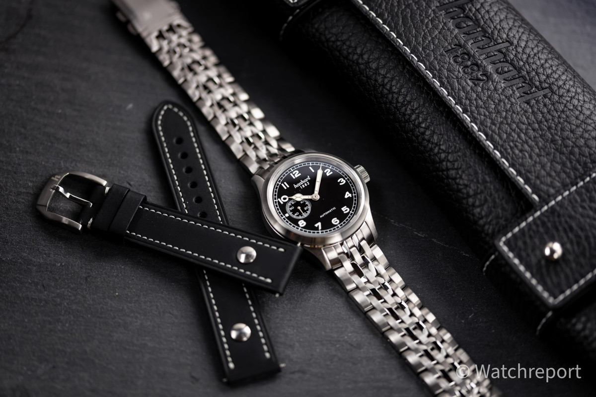 Automatic chronograph movement HAN3809 (bicompax), 28,800 vibrations per hour, 4 Hz, 28 jewels; Rotor with a skeletonized Hanhart logo; Power reserve of 42 hours